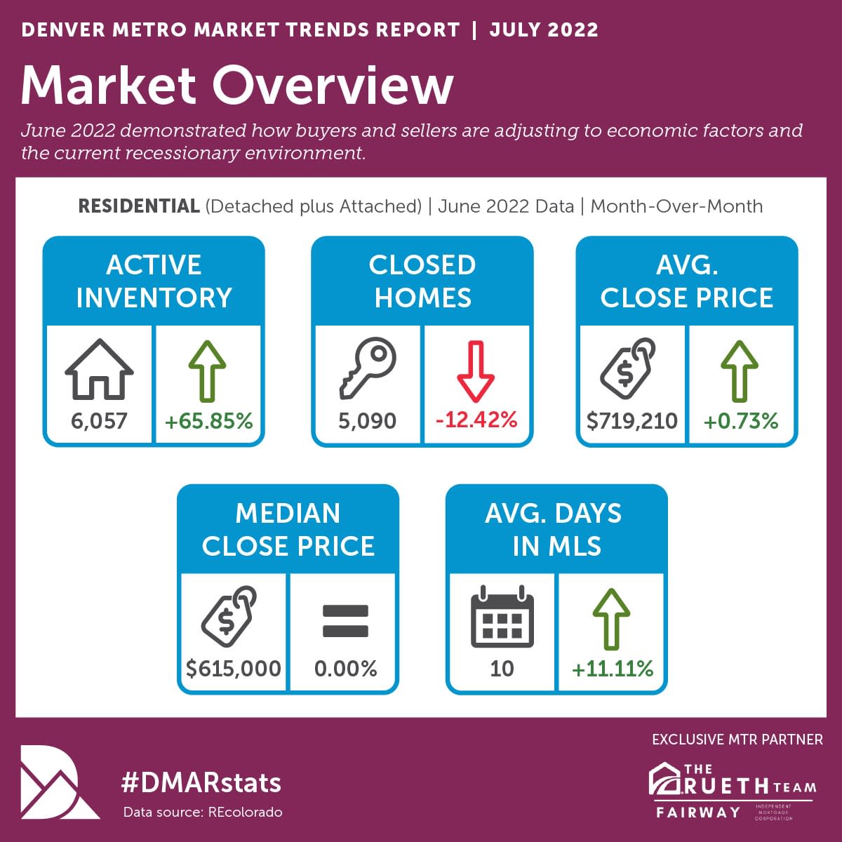“The increase in supply will eventually impact pricing, days in the MLS, and the relationship between buyers and sellers, which have negatively impacted buyers’ purchasing power,” commented Andrew Abrams, Chair of the DMAR Market Trends Committee and Metro Denver Realtor®. “The stock market, inflation, and cryptocurrency have all taken a hit in the last few months. Housing will eventually be a victim to the economy as a whole, but just how much is yet to be seen. It is realistic to see days in the MLS, currently sitting at a historic low of four, increase in the coming months.”