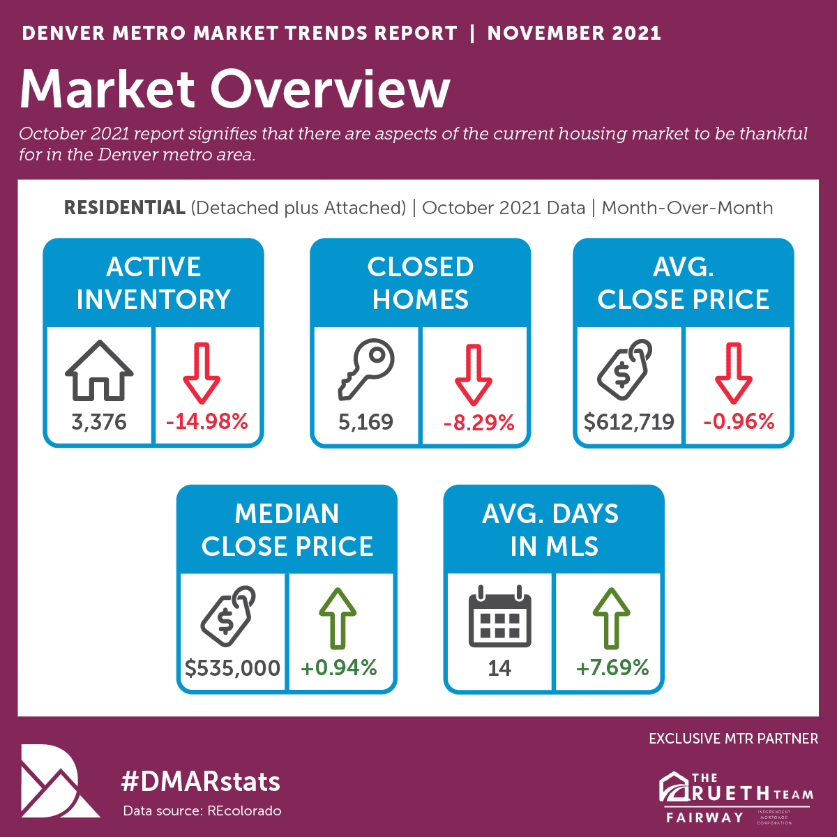 In a year of continued turbulence, October represented a month of relative ease. This last month signaling gratitude across the housing industry. Across the board, the majority of statistics were seasonally consistent with what Denver has seen in years past. This bodes well for more households having the ability to host a Thanksgiving dinner. With prices staying consistent month-over-month, the door has opened for buyers that were previously exhibiting burn out in the home search. We highlight some of the key points from this month’s real estate market update: