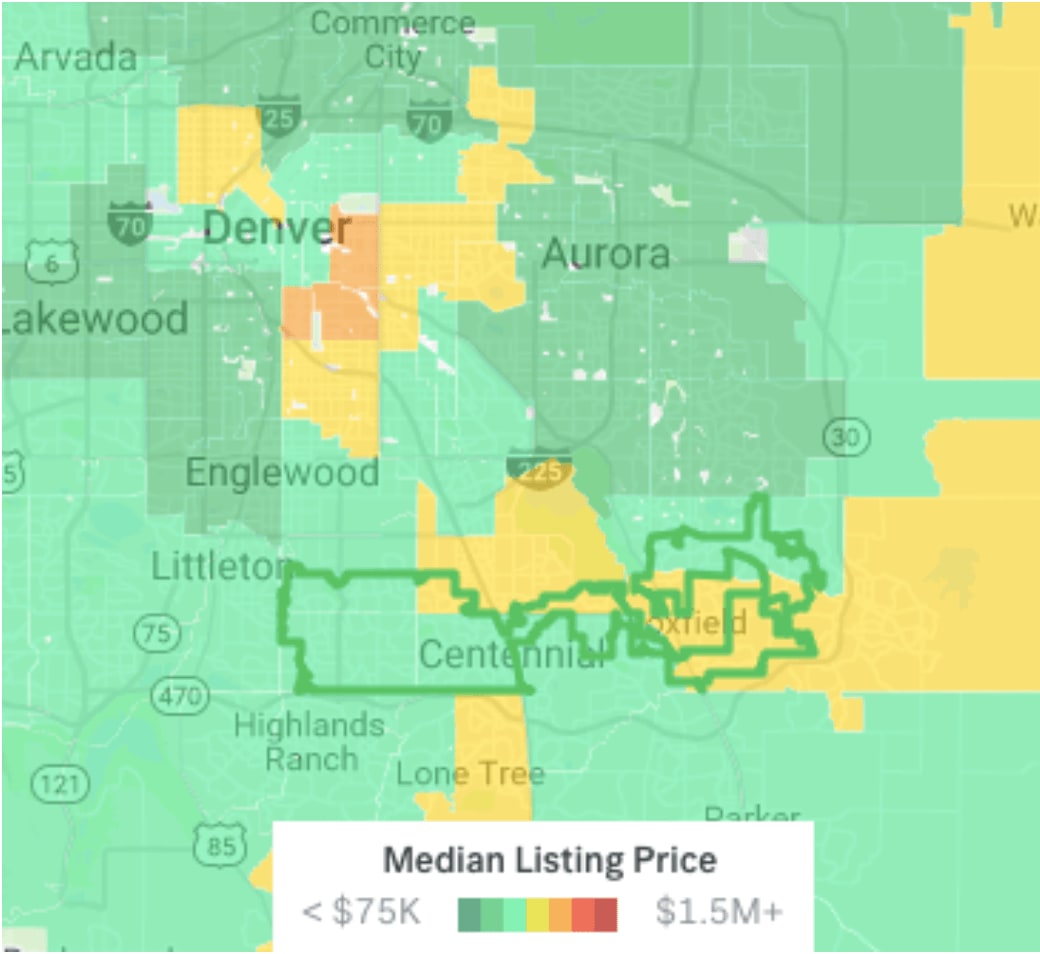 As you can see in the map below from Trulia, the home prices in Centennial, Colorado do not vary much. Looking at market trends in the area can help you understand the activity of a locale. According to Trulia, “Trends in Centennial show a 2% year-over-year rise in median sales price and a -1% drop in median rent per month.”